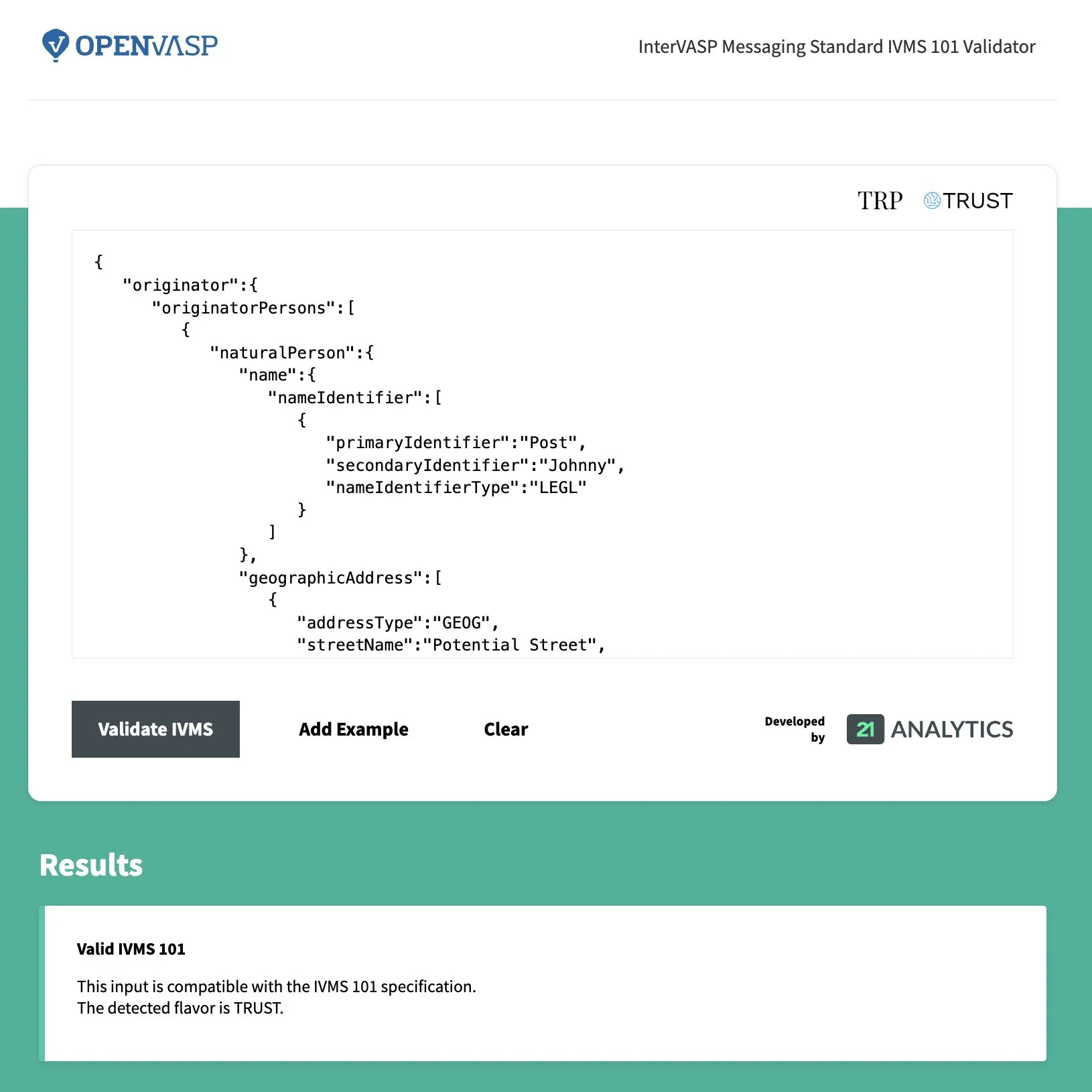 Firstly, IVMS 101 serves as the internationally recognised standard for Travel Rule data between VASPs. The OpenVASP Association’s IVMS Validator, developed by 21 Analytics, checks whether Travel Rule data is properly formatted according to the IVMS standard.